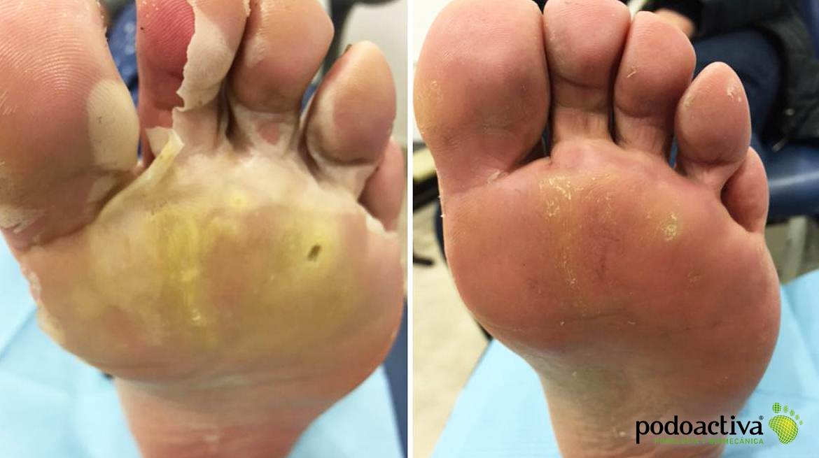 En la imagen anterior se puede observar el pie de una paciente que acudió a nuestra consulta tras utilizar durante una semana una crema con alta concentración en ácido salicílico. Como se puede ver, el resultado fue una quemadura y maceración de la piel y dolor al apoyar el pie. Además, el heloma, que era la causa por la que había usado el callicida, no desapareció.