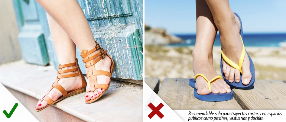 Es importante utilizar calzado que tenga sujeción en el tobillo y una suela resistente. Se recomienda usar calzado abierto y transpirable fabricado con materiales no agresivos a la piel. “Es importante utilizar calzado que tenga una suela resistente y evitar suelas demasiado planas y finas. Podemos forzar la articulación y que aumente la tensión generada en la fascia plantar, el tendón de Aquiles o los gemelos”, explica Javier Alfaro, director técnico de Podoactiva.