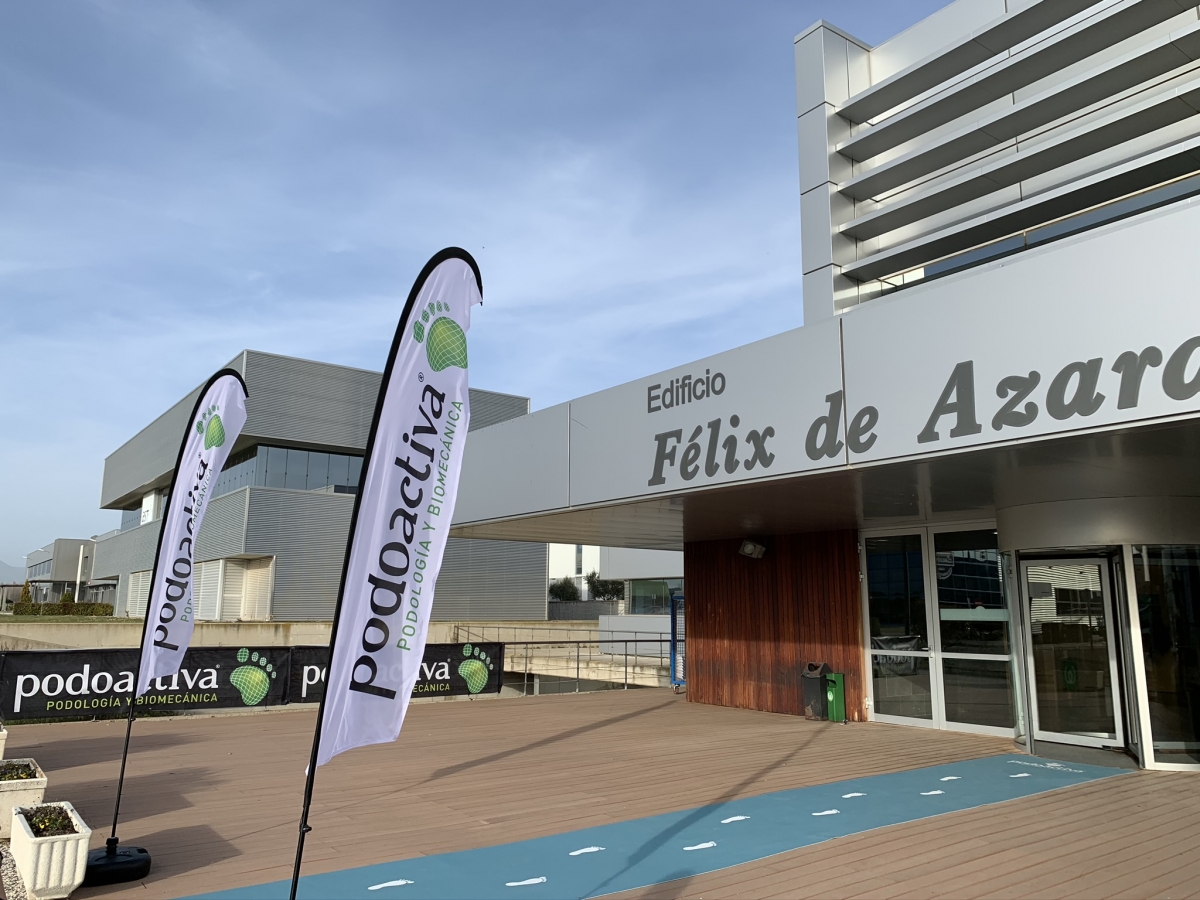 Así pues, tras la “foto de familia”, todo el equipo se desplazó hasta el Edificio Félix de Azara del Parque Tecnológico Walqa, cuya entrada estaba decorada para la ocasión, destacando la “alfombra verde Podoactiva”.