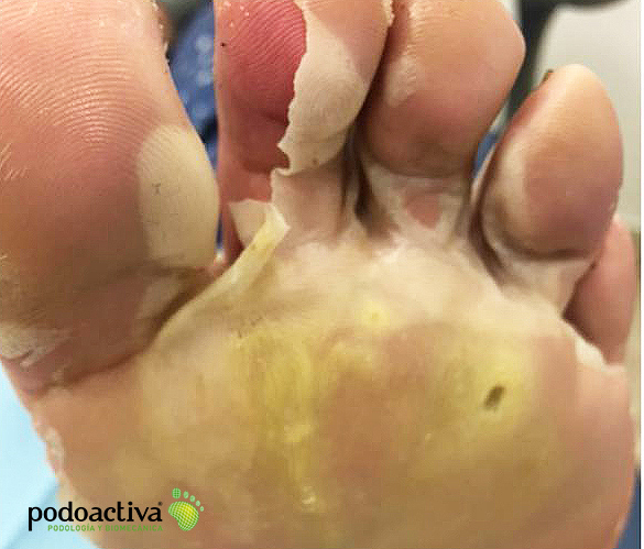 Acude a consulta refiriendo un mal uso de calzado, lo que le provocó una rozadura en el 5º dedo en la zona dorsal del pie derecho de varios días de evolución.