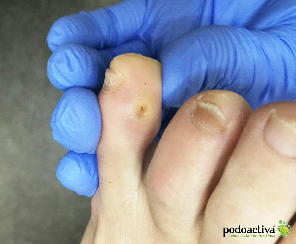Al inspeccionar el dedo se observa un aumento de la temperatura y un enrojecimiento que puede significar una infección subyacente. El podólogo decide realizar una radiografía del dedo para valorar el posible daño óseo y la afectación de la cortical (capa que recubre el hueso).