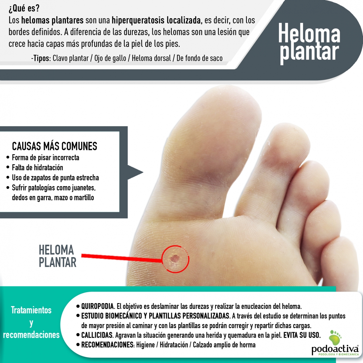 Los helomas plantares son una hiperqueratosis localizada, es decir, una lesión con bordes bien definidos que crece hacia capas más profundas de la piel del pie a diferencia de las durezas, que son más superficiales.