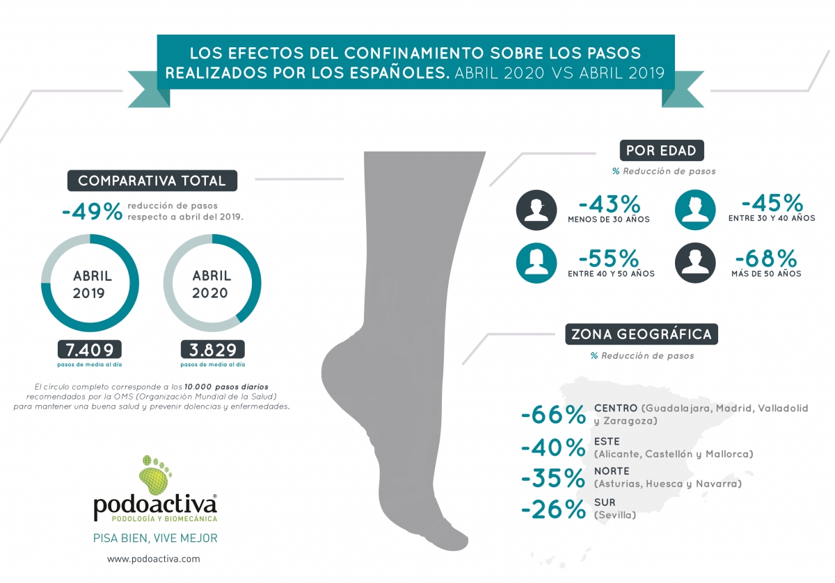INFORME FUNDACIÓN PODOACTIVA. El confinamiento reduce a la mitad el número de pasos diarios de los españoles