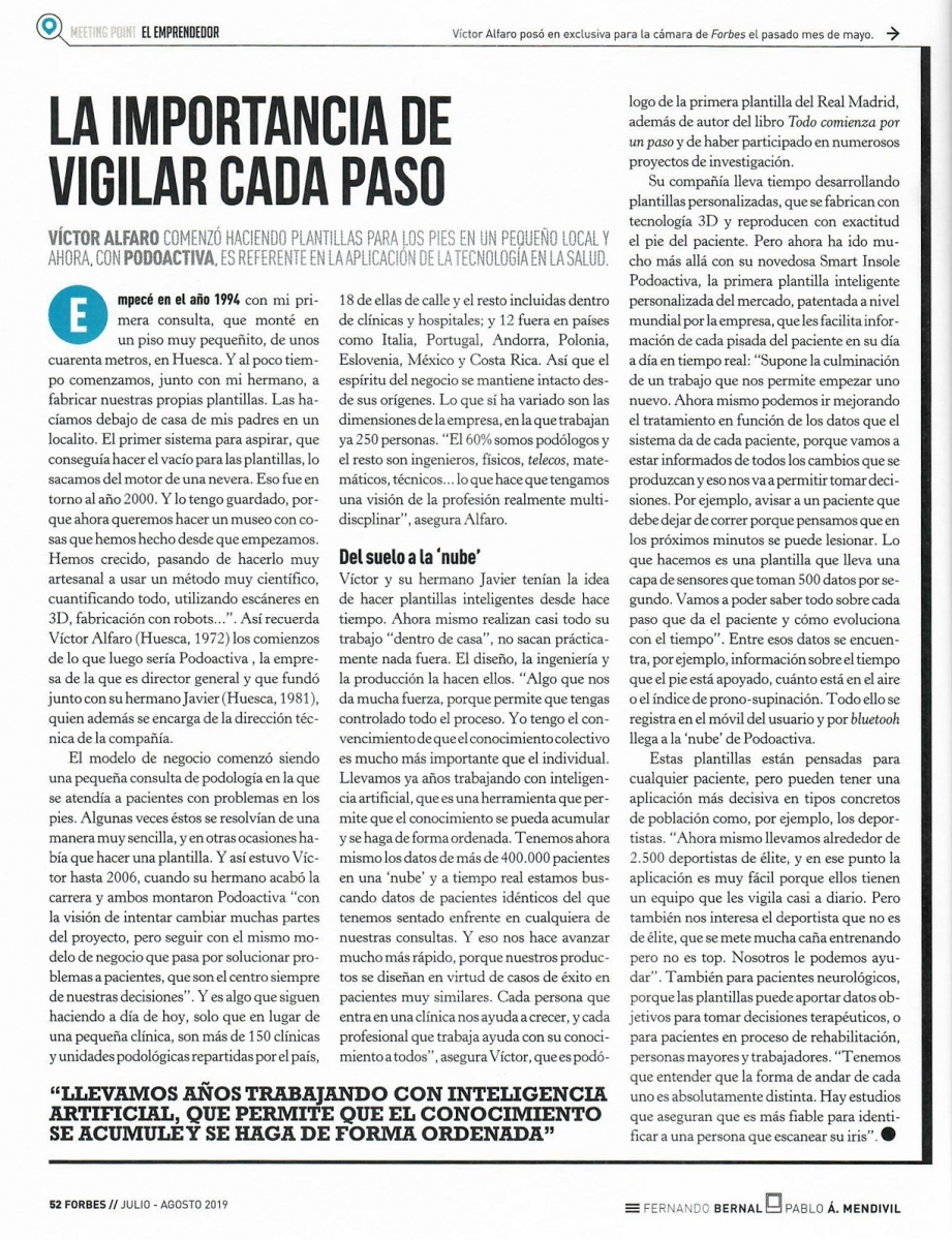 16 Jul 2019Bajo el titular “La importancia de vigilar cada paso”, la prestigiosa revista Forbes España entrevista a Víctor Alfaro, director general de Podoactiva, en su edición impresa de Julio-Agosto 2019.