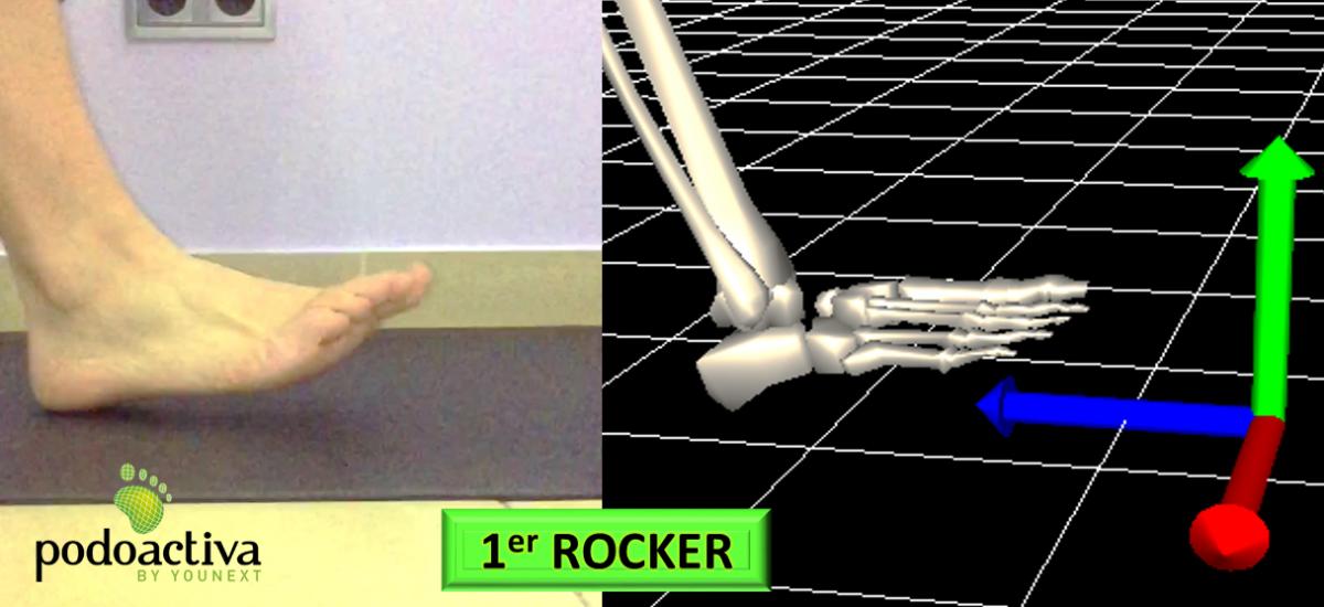 Cuando el pie acaba su fase de balanceo (40%) y empieza su fase de carga (60%), es entonces cuando se inicia el primer rocker del pie. También lo conocemos como balancín de talón, ya que después de impactar este sobre el suelo, debe rotar a través del hueso calcáneo hacia delante y abajo, permitiendo que el antepié acabe apoyando. Pueden existir problemas biomecánicos y no permitir que este rocker se ejecute correctamente. Una de las causas más comunes son los problemas de acortamientos de la musculatura posterior de la pierna, donde no se produce un impacto inicial del pie contra el suelo por la zona del talón, sino por la zona del mediopié (debido a la tracción hacia arriba y atrás que ejerce el tendón de Aquiles sobre el talón). Un ejemplo de alteración de este 1º rocker podría ser los niños que “caminan de puntillas” de una forma inconsciente.