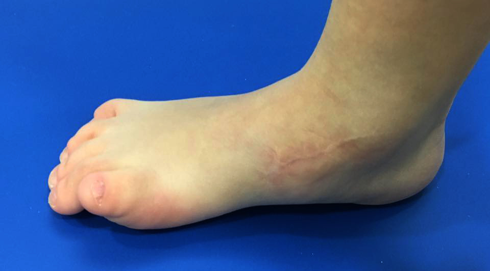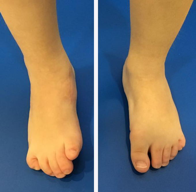 Bebé que nació con seis dedos en el pie derecho, uno de los cuales se encontraba en la zona anterior al maleolo tibial, delante del tobillo por el lado interno, y que fue extirpado correctamente. El primer metatarsiano y Hallux (zona del primer dedo) se han desarrollado muy poco, por lo que son insuficientes para ser funcionales en fase de despegue al caminar, generando el despegue únicamente por zona metatarsal central, que acaba muy sobrecargada.