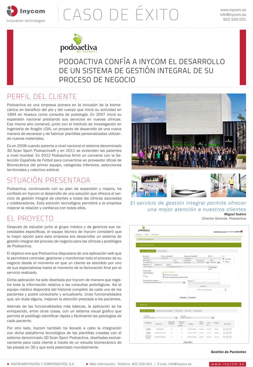 Inycom ha desarrollado una solución que ofrece servicio de gestión integral de clientes a todas las clínicas asociadas y colaboradoras de Podoactiva. El objetivo era que Podoactiva dispusiera de una aplicación web que permitiera controlar, gestionar y monitorizar todo el proceso de negocio desde el momento en que un paciente es atendido por uno de sus especialistas hasta el momento de la facturación final por el servicio realizado.