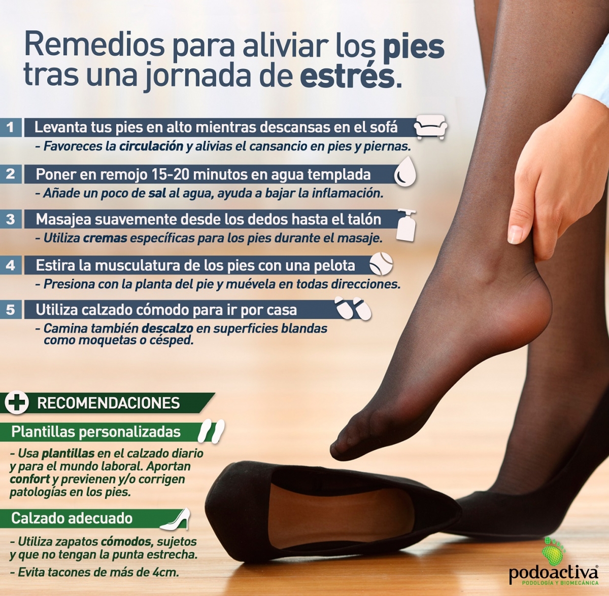 Tras una dura jornada, puedes sentir calor o inflamación en tus pies. Para solucionarlo, te recomendamos baños de 15 ó 20 minutos en agua templada con un poco de sal. Estas molestias disminuirán.