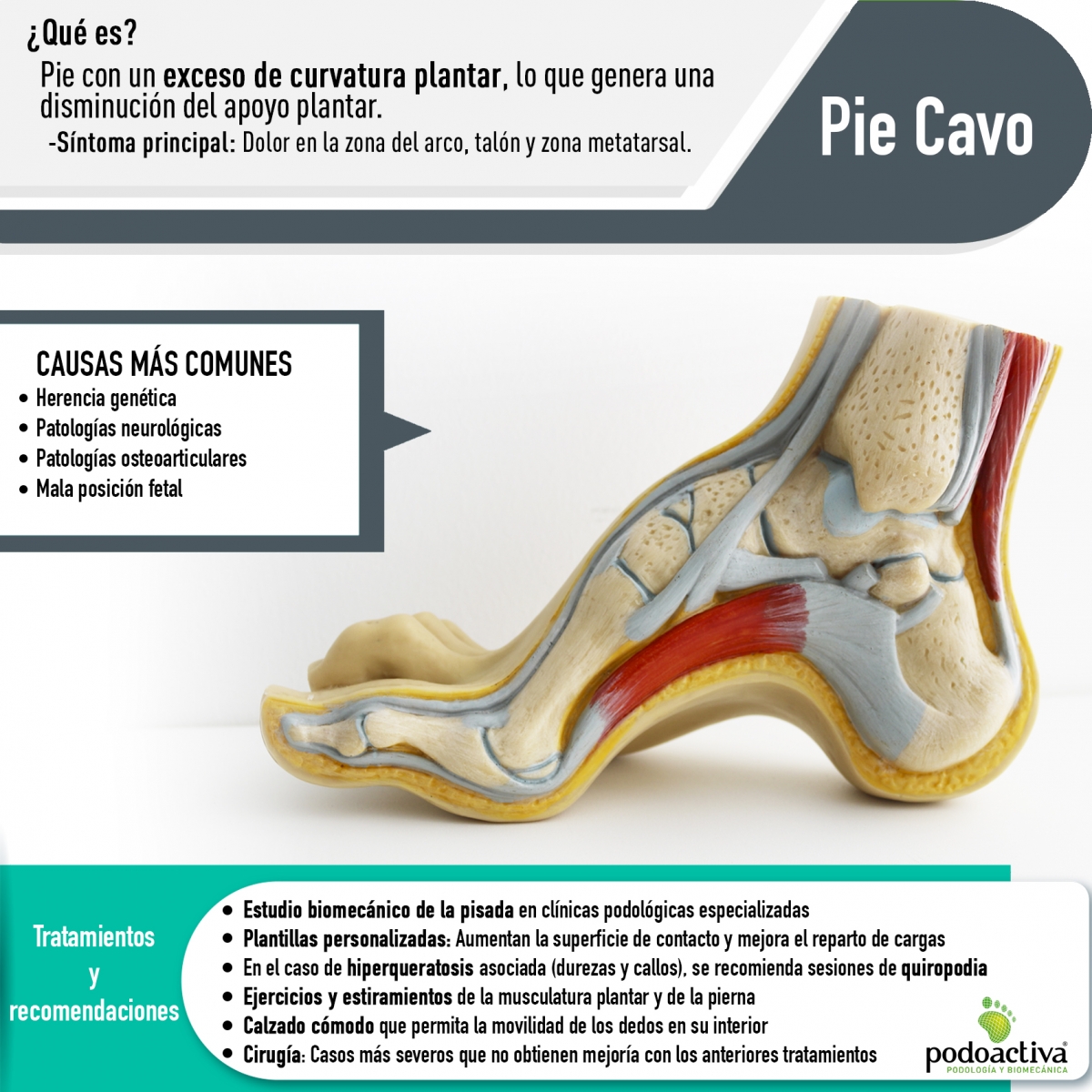 Un pie cavo se caracteriza por un exceso de la altura de la bóveda plantar y se da cuando se tiene más arco del habitual. Puede acompañarse de una desviación del eje hacia interno y externo, o mantenerse neutro. Son pies habitualmente más reactivos y explosivos, debido a la cantidad de retracción y potencia muscular que los caracteriza.