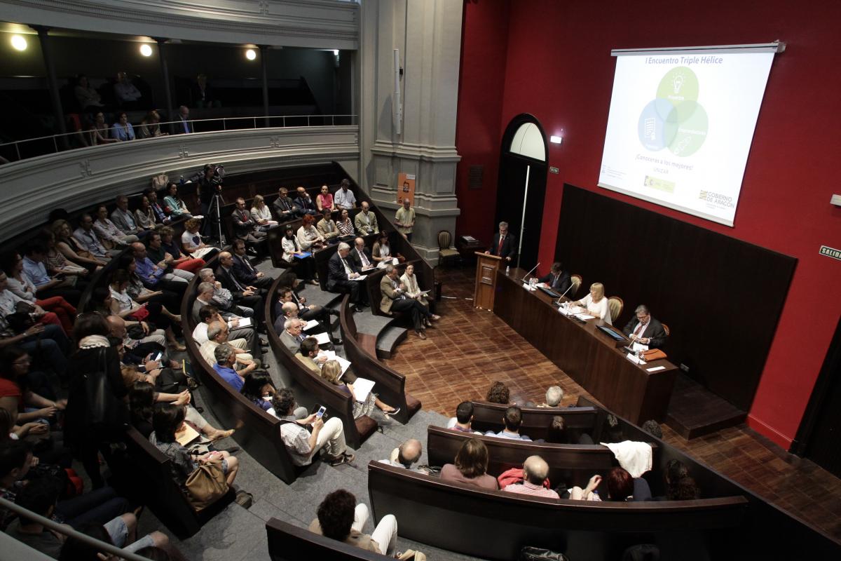 El acto ha sido presidido por la Vicerrectora de Transferencia e Innovación Tecnológica, Pilar Zaragoza; el Consejero de Industria e Innovación del Gobierno de Aragón, Arturo Aliaga; y el Presidente de la Cámara Oficial de Comercio, Industria y Servicios de Aragón y Presidente de Honor de la Cámara de Comercio de España, Manuel Teruel.