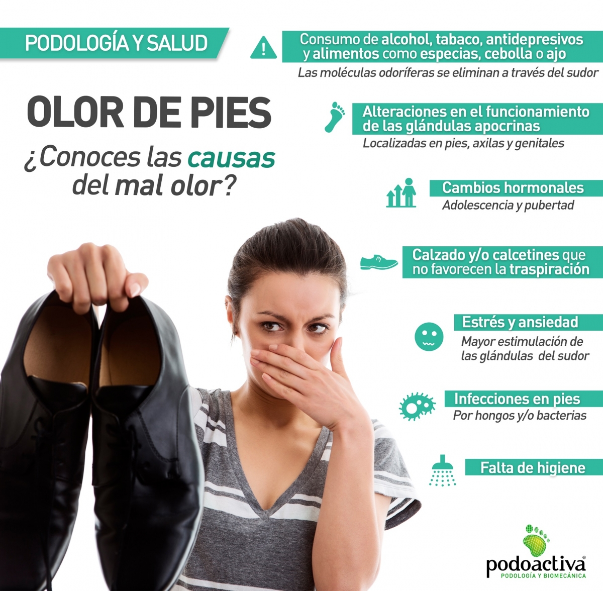 - Hormonales: Suele darse en la adolescencia o pubertad. Los cambios hormonales (salida de vello, comienzo del periodo, acné…) juegan un papel importante en esta época. Estos cambios vienen dados por descargas y cargas hormonales que originan desechos. A su vez, éstos se eliminan por varias vías como las glándulas sudoríparas de los pies.