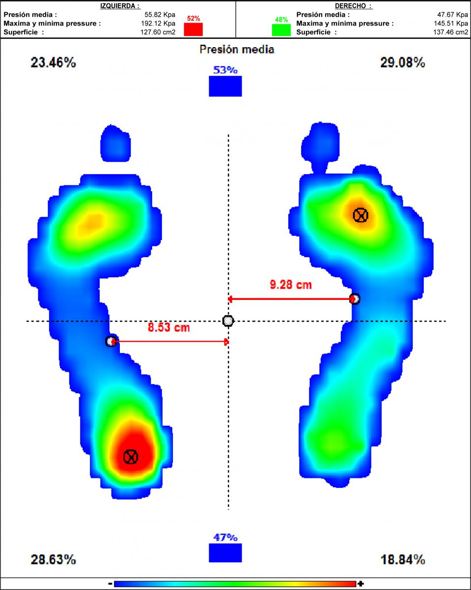 La distribución de la carga entre ambos miembros inferiores es correcta con un 52% en el pie izquierdo y un 48% en el pie derecho. Este equilibrio de pesos, se debe a las diferentes compensaciones podales que crea su organismo.